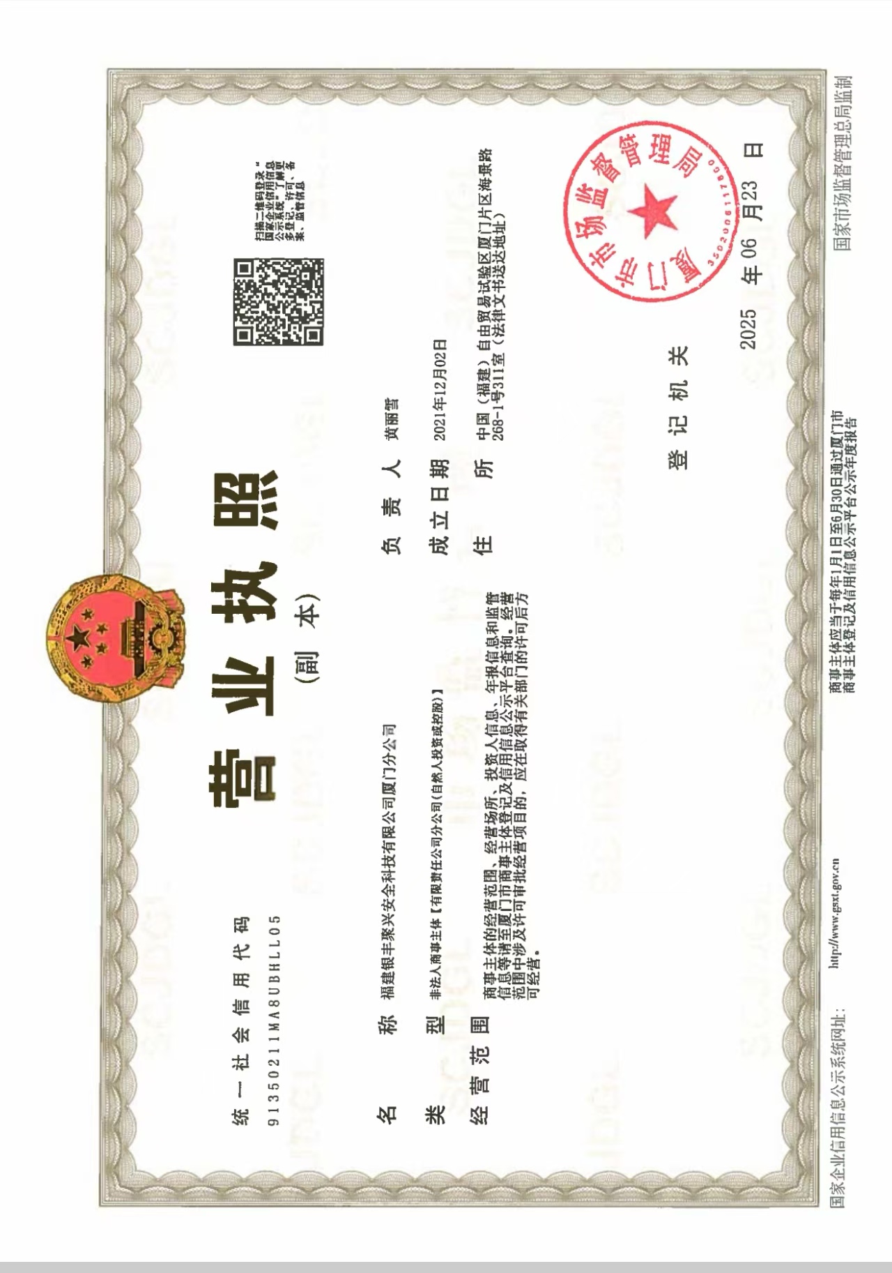 • 廈門(mén)分公司營(yíng)業(yè)執(zhí)照